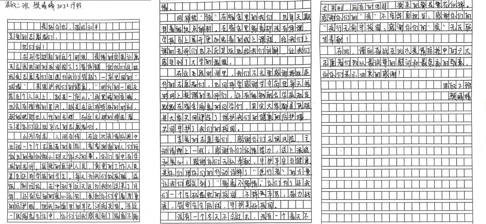 青春灼灼其华,担当历历在目。在此次疫情中,我们的志愿者主动请缨,积极配合医护人员的工作。如今,疫情的圆满结束,马克思主义学院于9月28日在线上开展以“疫路有你,温暖相行”为主题的写信活动。