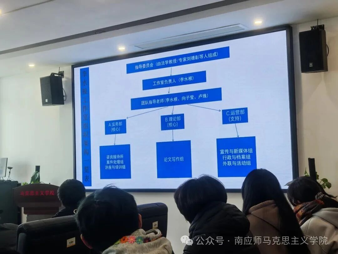 随后,李水根介绍了工作室的发展规划,明确其以“法律理论+实务实践”为核心的培养方向,并提出“学习、奉献、成长”三大价值理念与“内驱力、坚毅、开放、智慧、领导力”五项目标,鼓励成员结合目标做好大学四年学业与能力发展规划,在理论钻研与实务锻炼中实现自我成长。同时,他通过组织架构图展示了工作室“指导委员会-工作室负责人-团队指导老师-实务部/理论部/运营部”的三级管理体系,清晰划分了各部门(咨询接待、案件处理、论文写作、宣传新媒体等)的职能定位,为工作室规范化运作奠定基础。