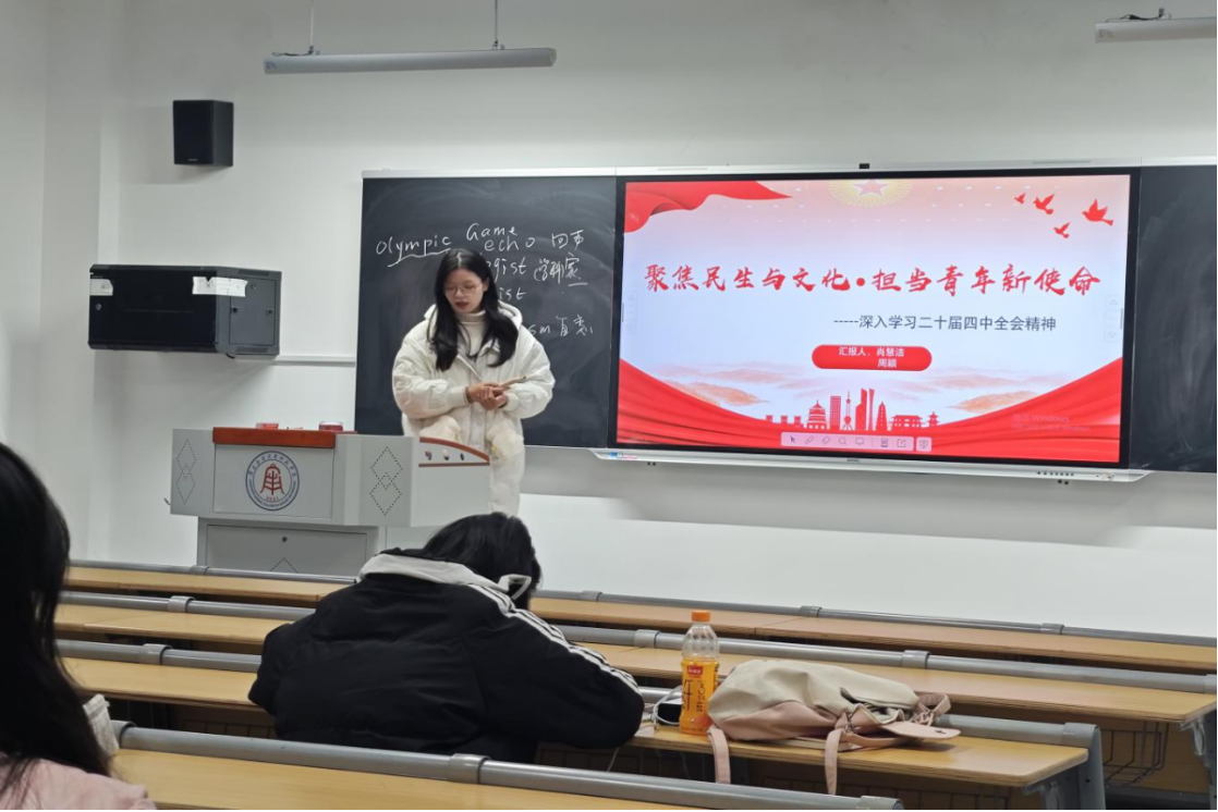 宣讲伊始,肖慧洁以“党的二十届四中全会核心要义解读”为切入点,从会议重大历史意义与核心部署展开讲解,重点聚焦全会在保障和改善民生领域的战略规划,结合就业扶持、教育提质、养老保障等与青年成长、群众生活紧密相关的领域,具象化阐释国家政策如何落地见效、惠及民生,让宏大的“国之大者”与具体的“民之关切”深度衔接,帮助同学们直观理解全会精神的实践价值。随后,她围绕文化建设维度展开论述,强调新时代推动文化繁荣、建设文化强国的重要意义,引导同学们深化对文化自信的认知,激发主动担当文化传播使命的思想自觉。