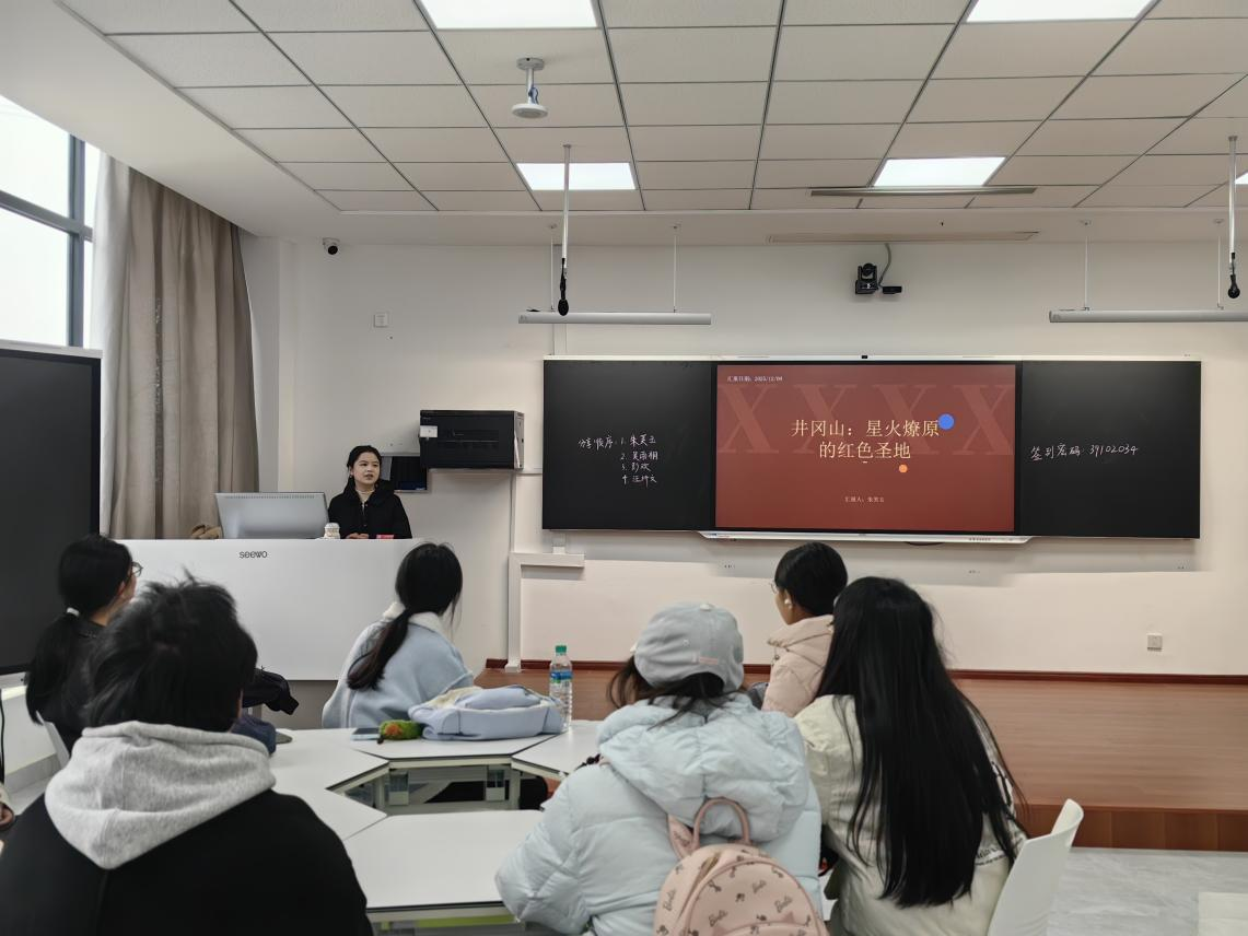主题分享环节中,四位同学依托精心制作的PPT,带来了一场场生动深刻的红色宣讲。朱芙玉同学以“井冈山:星火燎原的革命圣地”为题,深入阐释井冈山精神的核心内涵与时代价值;吴雨桐同学聚焦“恽代英的生平与光辉事迹”,深情讲述革命先辈为信仰献身的热血征程;彭欢同学回溯“共青城垦荒的故事”,再现一代青年扎根荒原、艰苦创业的奋斗史诗;汪纤文同学则以“倪新华与共青的坚守”为切入点,刻画了平凡岗位上坚守初心、践行使命的动人图景。