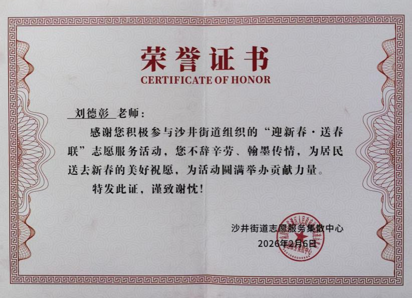 2月6日下午,我院副院长刘德彰参加了南昌市红谷滩区沙井街道组织的“迎新春,送春联”志愿服务活动,与其他志愿者一道书写春联,为社区居民送去了新春的美好祝愿。
