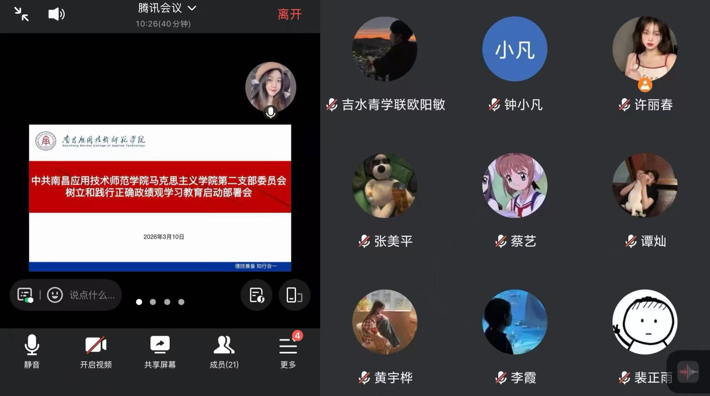 党总支副书记雷欢欢传达学习中央党的建设工作领导小组会议精神,以及省委、教育部党组、省委教育工委关于开展树立和践行正确政绩观学习教育的相关要求。张欣康领学了《习近平关于树立和践行正确政绩观论述摘编》,组织员吴昱杉就学校开展树立和践行正确政绩观学习教育的工作作了解读。